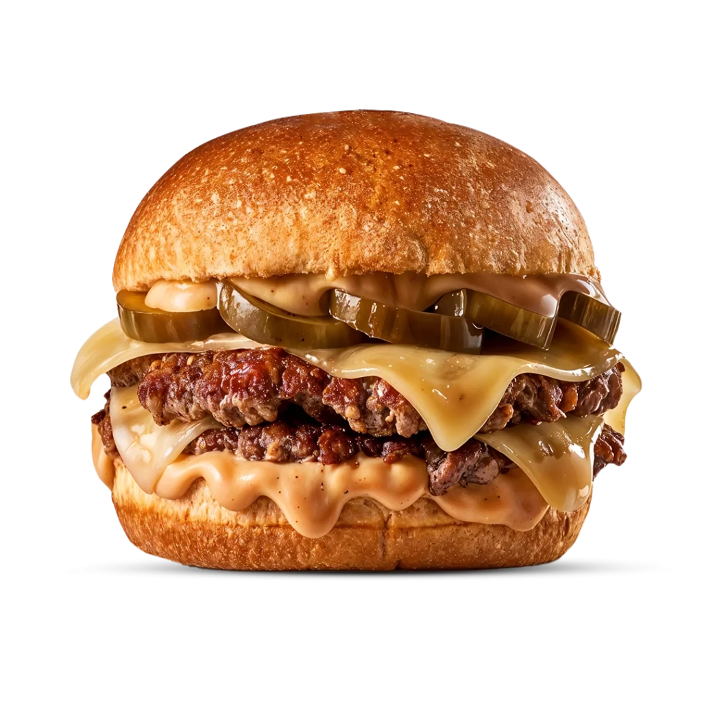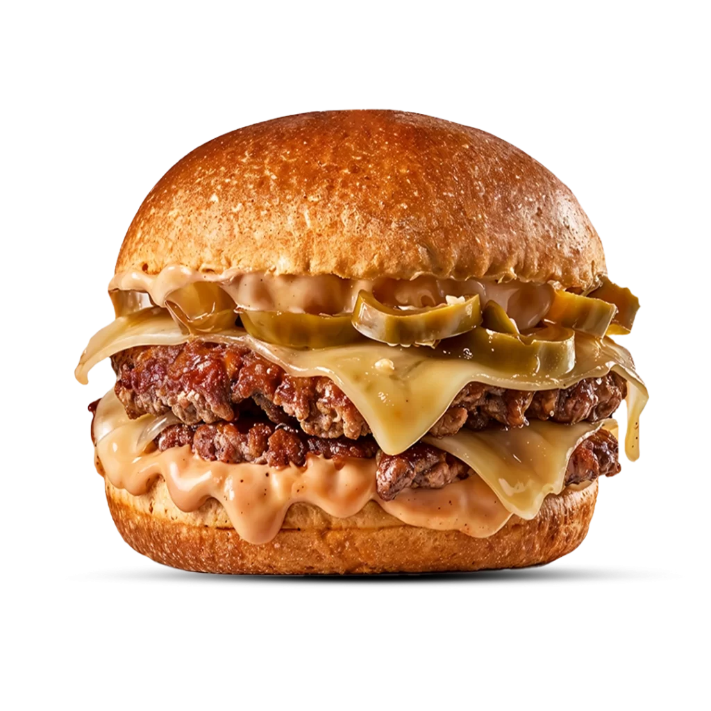 Double black angus beef patties smashed with thinly shaved onions, cheddar cheese, house sauce, house pickles in a soft brioche bun
