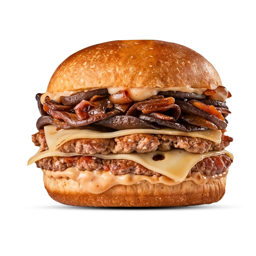 Double smashed black angus beef patties, cheese, Sauteed fresh Portobello mushrooms, caramelized onions, house sauce in a soft brioche bun