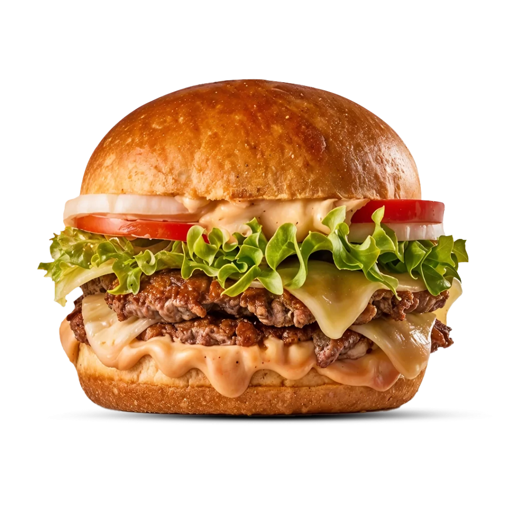 Double smashed black angus beef patties, cheddar cheese, house sauce, lettuce, tomatoes, thinly sliced onions in a soft brioche bun