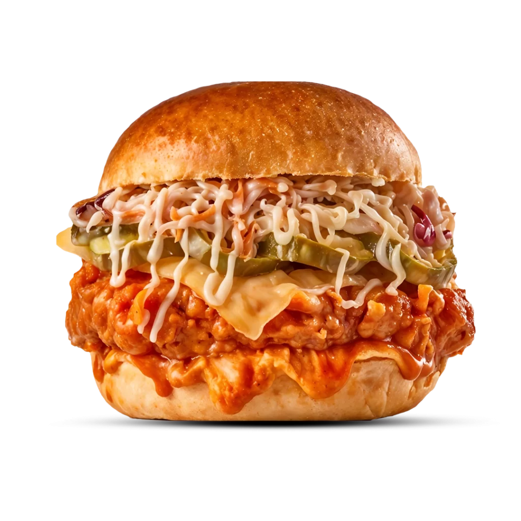 Double smashed black angus beef patties, cheddar cheese, spicy house sauce, house jalapeno pickles in a soft brioche bun