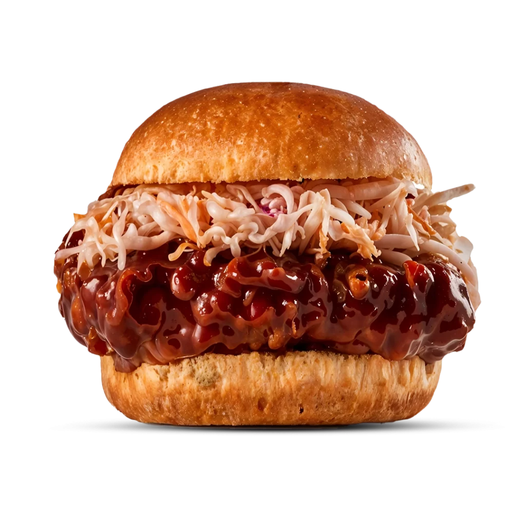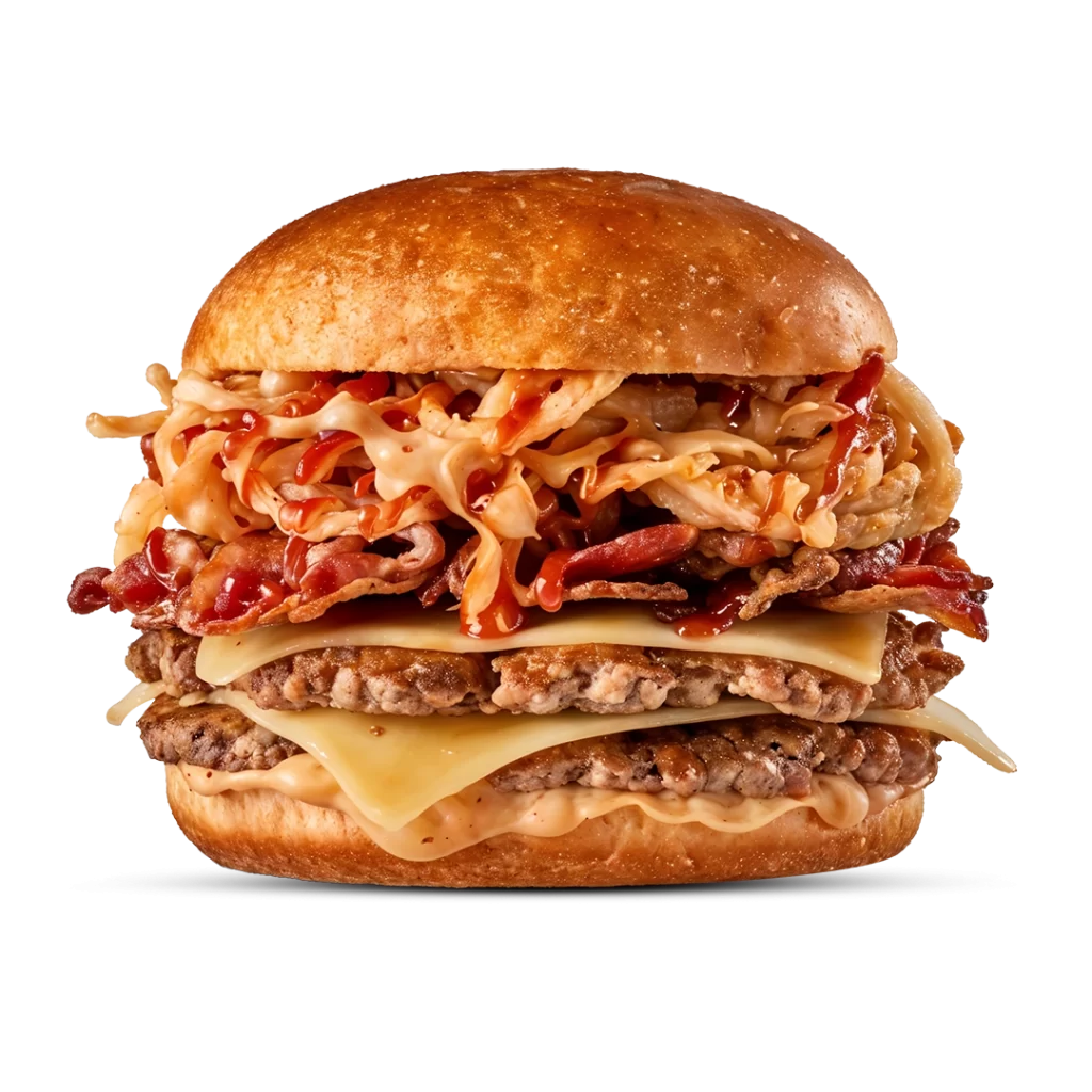 Double smashed black angus beef patties, cheddar cheese, smoked Angus beef bacon, thinly sliced fried onions, BBQ sauce, house sauce in a soft brioche bun